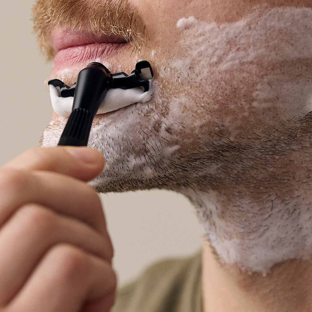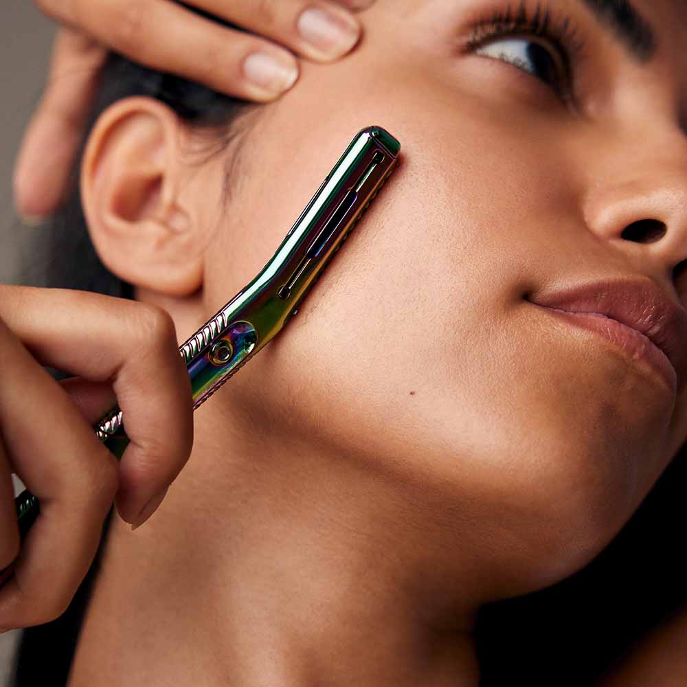 The second difference is in the technique and tools — there is a mechanical difference in what’s happening between the tools you use, your skin, and hair. Shaving razors present blades against your skin at a shallow angle, typically between 20° and 30°. The goal is for the blade to glide along your skin and slice through hair as close as possible. Dermaplaning blades are presented to your skin at a much wider angle, typically about 45° to allow the dermaplaning blade is to wipe away dead skin cells away. In the process, it will also remove fine hairs from your face. Tools like Leaf Dermaplaner forces a 45° angle by design and material surrounding the blade edge.